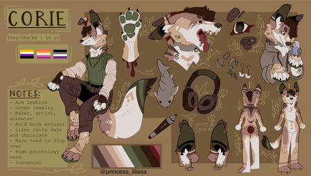 Ref sheet #2: Fullbody and headshot of the character, accessories, hand, mouth, description, name, palette: 45 USD